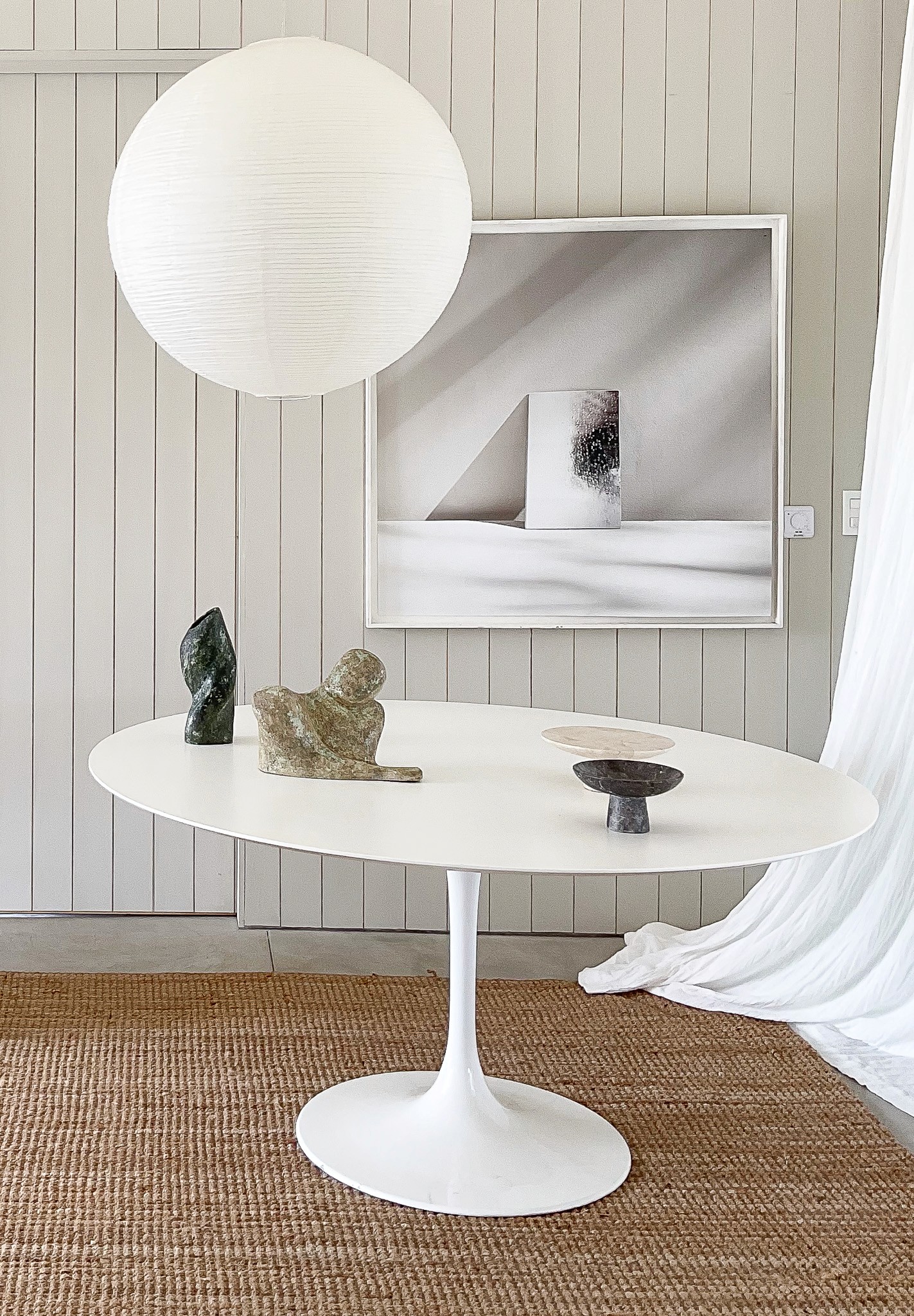 Autor/Marca: Eero Saarinen Materiales: Madera laqueada y aluminio Descripción: La Mesa Tulip con tapa de madera laqueada blanca, diseñada por Eero Saarinen, es una obra maestra del diseño moderno. Su base de aluminio y su superficie laqueada proporcionan una estética elegante y limpia, ideal para cualquier comedor o sala de estar que desee un toque de sofisticación y estilo contemporáneo. Período de Fabricación: 1956