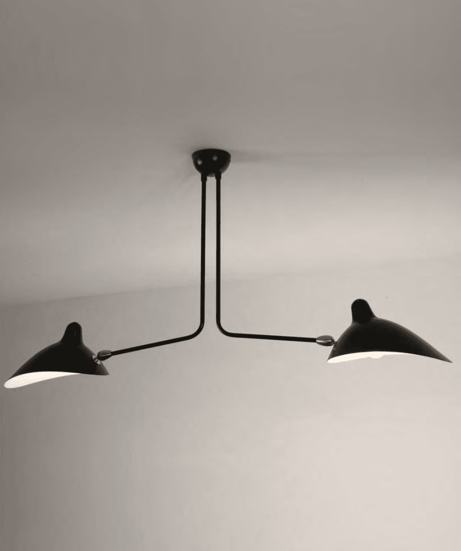 Autor/Marca: Serge Mouille Materiales: Acero lacado y bronce Descripción: Esta lámpara de techo con dos brazos diseñada por Serge Mouille es una obra maestra del diseño moderno. Con sus líneas elegantes y funcionalidad versátil, ofrece una iluminación óptima y un estilo único que realza cualquier espacio contemporáneo. Período de Fabricación: 1966